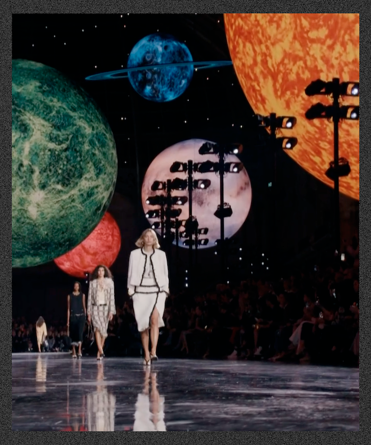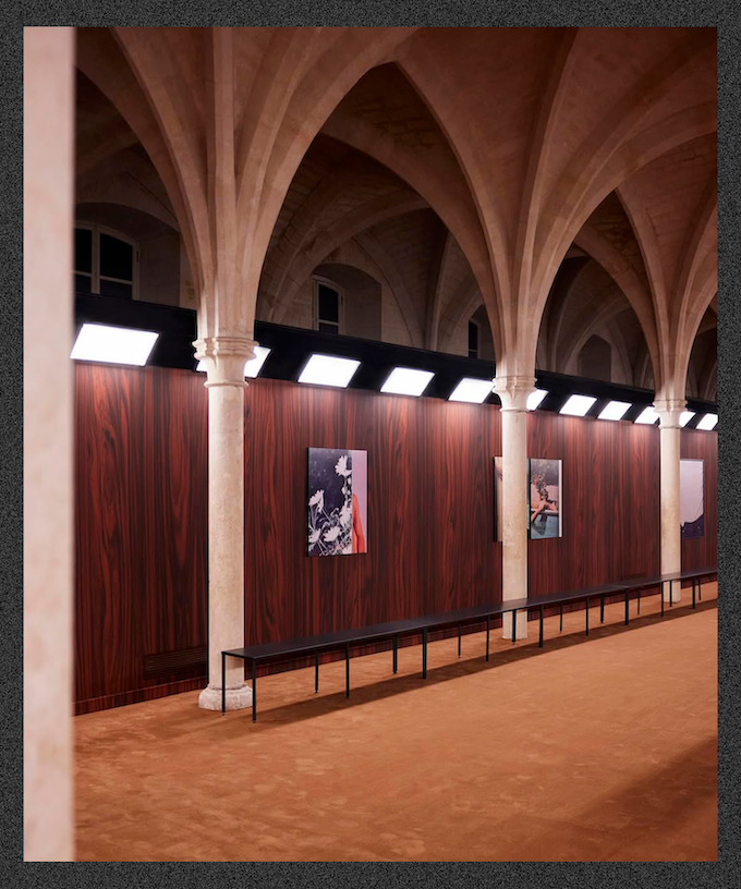 SHOW → Propositions de compositions graphiques du parterre de fleurs et des bougies au sol, assemblage des motifs Toile de Jouy des bancs sur mesure, propositions créatives pour photocalls, fitting module, press kits, signalétique.